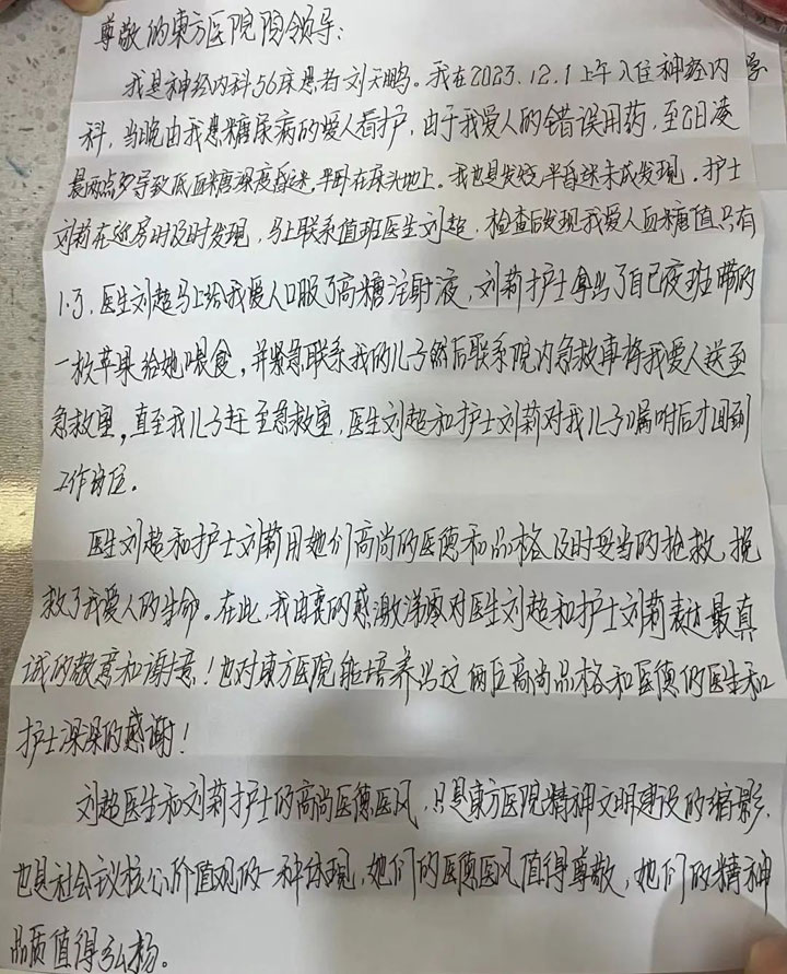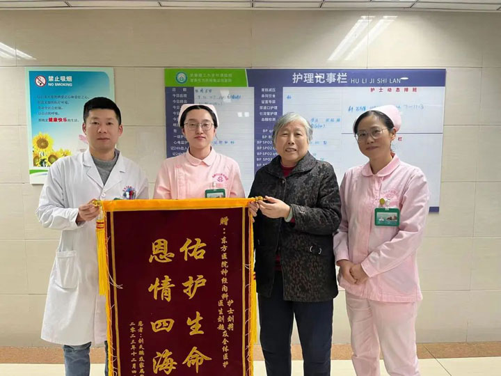 “真的很感谢神经内科的刘莉护士和刘超医生,如果不是他俩,我母亲可能就不在了。”近日,一面写有“佑护生命,恩情四海”的锦旗伴随一封手写感谢信送到了淮南东方医院集团总医院神经内科,患者刘大爷的儿子不光感谢神经内科全体医护人员对父亲精心救治,还感谢他们对自己母亲抢救的及时。