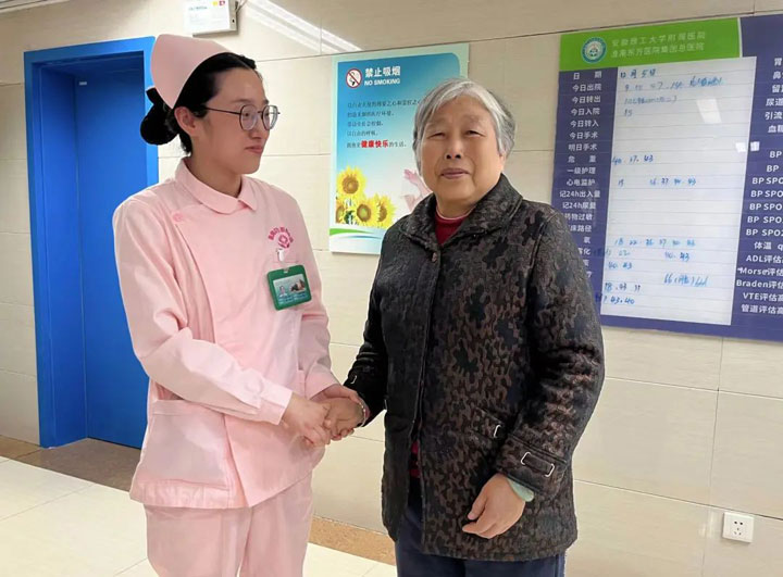 张大娘的丈夫因近期流感引发了原先的基础病住进神经内科病区,作为患者家属,张大娘端水喂饭,悉心照顾。晚上张大娘在病房照顾刘大爷时突然晕倒在地,神志不清,当时刘大爷正发高烧处于半昏迷状态,也没有发现身边异常。凌晨两点,护士刘莉像往常一样巡视病房,走到刘大爷房间时,发现张大娘半卧在床头地上,刘莉立马联系值班医生刘超,对刘大娘进行抢救,检查后发现刘大娘血糖值只有1.3,刘医生立刻给大娘口服了高糖注射液,片刻过后,她才慢慢苏醒过来,恢复意识,刘莉拿出苹果给大娘让她吃下。随后他们把刘大娘送去了急诊室,直至大娘的儿子赶到医院,他们才放心返回工作岗位,“多亏你们及时抢救,谢谢你们!”对于医护人员迅速果断地抢救措施,张大爷的儿子非常感激。