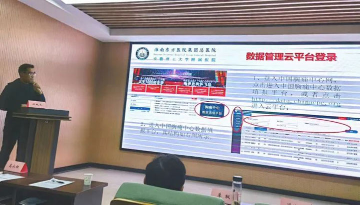 淮南东方医院集团总院心内科行政主任汪蛟龙则向大家进行了胸痛救治单元数据上报培训。他指出数据上报在确保治疗质量和提升服务效率方面的关键作用。点评专家凤台县新长征医院心内科副主任 高应成教授和淮南东方医院集团广济医院心内科主任 桂陈教授分别从医疗信息化和临床实践的角度出发,讨论了数据管理在胸痛救治中的应用与挑战。