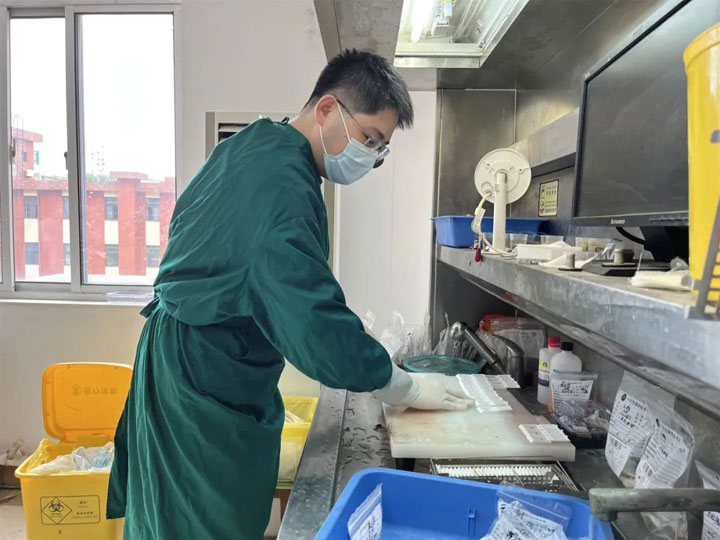 寒暑易节,翟世麟一直专注于病理标本取材及常规病理诊断工作。学习与实践结合,让他开阔了眼界,积累了经验,增长了本事。病理科工作,是一项经年累月坐“冷板凳”的事业,一般非年长不足以诊病断疾、一锤定音。而凭借钻研付出,翟世麟在业务领域尽情遨游,进步很快,年轻的他如今已能对大多数常见常规病理进行独立诊断,并对部分术中冰冻病理在科主任审核情况下进行诊断、出报告。