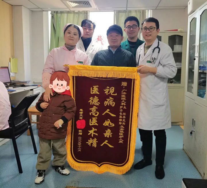 “每一次来广济医院,医生护士都特别好。这次宝宝一住院我就去订了一面锦旗。”宝宝爷爷说:“之前也遇到过不少医生,感觉这里医生护士不仅看病技术好,对孩子和家属也很有耐心。我想跟他们说声谢谢。”