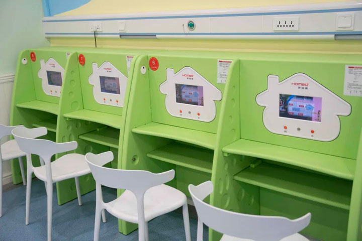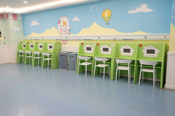经过升级装修后的智能雾化中心为独立的空间,拥有独立的诊区,墙壁上画了卡通图案,符合儿童活泼的个性,并且能够让他们对医院环境产生好感。中心共配备8台智能雾化机,机器配色活泼,并集成有显示屏,就诊的小患者可以在这里收看动画片。雾化中心附近设有服务站,小患者和家属进入雾化中心后,服务站将药物调配好即可进行雾化。