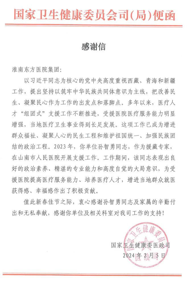在2024年新春佳节之际,两封感谢信跨越千里,从国家卫生健康委医政司发出,来到淮南东方医院集团,在致以诚挚的问候和节日的祝福的同时,感谢东方医院集团对“组团式”援藏工作的大力支持,并对援藏专家——心内科医疗中心孙智勇医生给予高度赞扬和肯定。