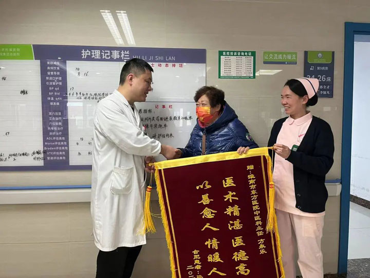 面对感激,方主任一直强调“这都是我们应该做的。”朴实的言语,鲜艳的锦旗,彰显的是医患之间的真诚与和谐,传递的不仅是患者的感激之情,更是对医院服务品质和医疗技术的认可,对医护人员工作的充分肯定。方主任表示将继续深入落实“一切为了病人”的服务宗旨,继续用精湛的医疗技术和优质的护理服务保护患者的生命健康。
