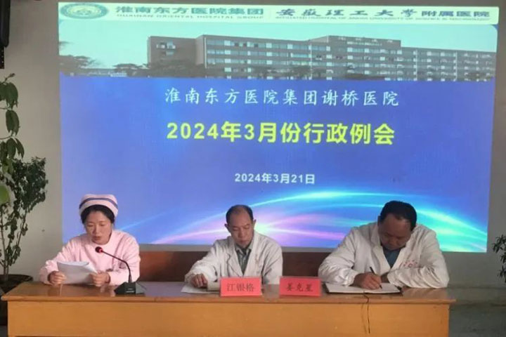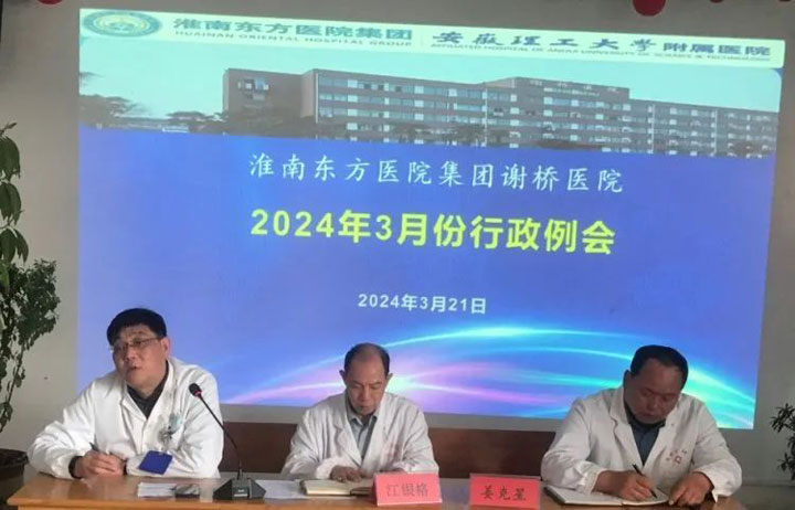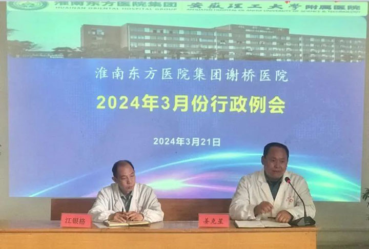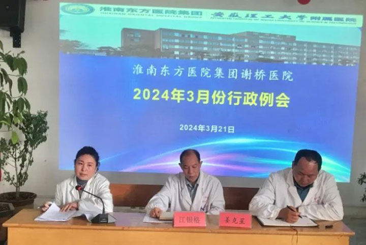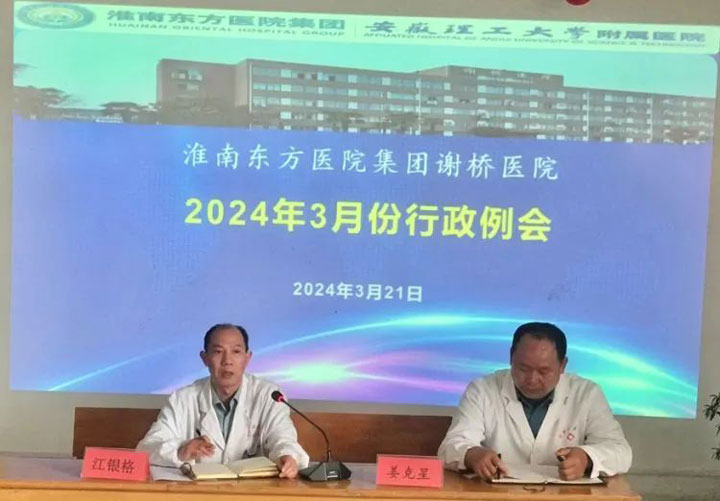 2024年3月21日下午,淮南东方医院集团谢桥医院行政例会在一楼会议室举行。谢桥医院院长姜克星、党总支书记江银格、副院长许文进、医政部、护理部及各科室负责人参加会议。会议由院长姜克星主持。
