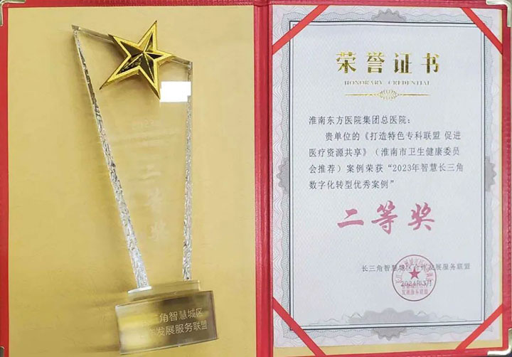 会上,长三角智慧城区合作发展服务联盟正式发布“2023 年智慧长三角数字化转型优秀案例”,并为获奖单位进行颁奖。由淮南市卫健委推荐,东方总院凭借“打造特色专科联盟,促进医疗资源共享”这一案例荣获二等奖,案例中提及的长三角心胸外科疾病治疗专科联盟项目对推动医疗资源跨地区共享,实现沪苏浙皖基本医疗服务高质量一体化,共筑“健康长三角”发挥的示范引领作用得到了现场专家的一致认可与好评。