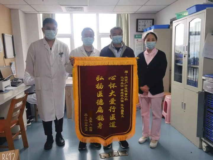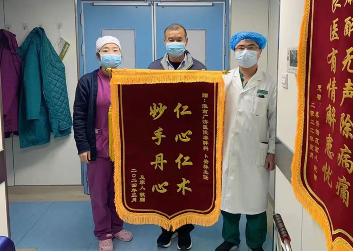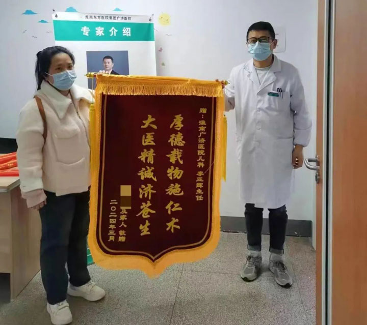 术后,儿科李亚辉主任多次会诊,协助外科团队精心管理,在大家共同的努力下,不久孩子康复出院。为了表示对所有医生护士的感谢,辰辰的家长将三面锦旗送到了麻醉科、儿科和外科。千言万语,汇成一面面锦旗。