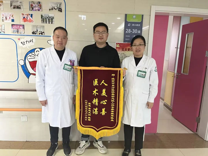 无独有偶,张俊夫妇也为黄主任送来了“人美心善,医术精湛”的锦旗,张先生的女儿因发热、咳嗽到东方总院儿科就诊。入院后,黄主任结合孩子情况制定了治疗方案给予治疗。住院期间,加上孩子本身发热反复,张先生焦急万分。儿科护士长廖红光了解情况后,除了对孩子精心护理,还对孩子家长进行详细的健康知识宣教。廖护士长经常带领护理团队与家长沟通孩子常见疾病的预防措施与家庭护理技巧、饮食指导等。经过治疗,张先生的孩子得以康复,顺利出院。出院时,黄主任再三叮嘱,并表示日后有需求可随时拨打科室电话咨询。孩子父母十分感激地说:“真心感谢东方总院儿科所有医护人员,你们真的非常有耐心,细致的讲解也缓解了我们家长不安的情绪,精心的护理让我们感受到了护士的专业和真诚。”