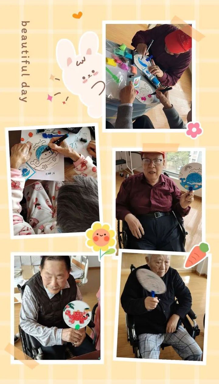 活动现场,医护人员为老年病人准备了丰富多彩的手工材料,包括彩纸、毛线、布料等。在医护人员的指导下,90多岁的老年患者们仿佛回到了儿时的课堂,纷纷动手制作,有的进行绘画,有的制作漂亮的扇子。医护人员则将老年患者们的作品贴在科室的活动墙上,作为对他们的鼓励。