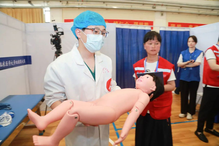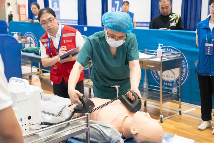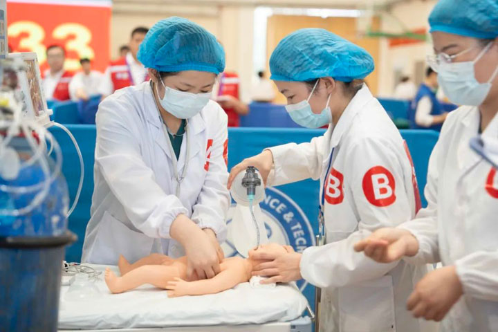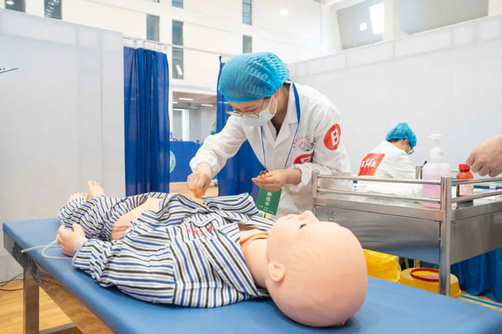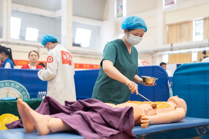 本次临床技能大赛参照中国大学生医学技术技能大赛赛制,初赛设置8个站点,决赛设置4个赛道,内容诊断性刮宫术、导尿术、吸痰、胃管置入、吸氧、胸腔穿刺术、动脉穿刺术、骨髓穿刺术、腹腔穿刺术、手术切口清洁换药、心脏体格检查、新生儿窒息复苏、脊柱外伤搬运、手术切口消毒铺巾、缝合、心肺复苏+电除颤等多个临床实际病例,模拟临床真实情景,考量操作速度和质量,充分考查学生临床思维、技能操作、应变与团队协作能力。