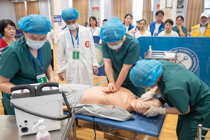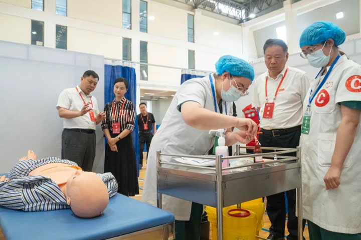 在比赛现场,每队4名学生按命题要求完成操作,选手们精神状态饱满,沉着冷静、反应迅速、判断准确、操作流畅、合作默契,通过初步诊断、器材物品选择、临床操作、后期处理等步骤,在规定的时间内有条不紊地完成了各项操作,展现了较为扎实的理论功底和娴熟的临床技能,赛出了风格,充分体现了各单位良好的临床带教水平。裁判员细致观察选手操作,严格执行比赛规程,确保评分公正、公平。赛场外,专家进行现场点评,并进行实况直播和现场教学,共上一堂深刻的临床智慧医教大课。