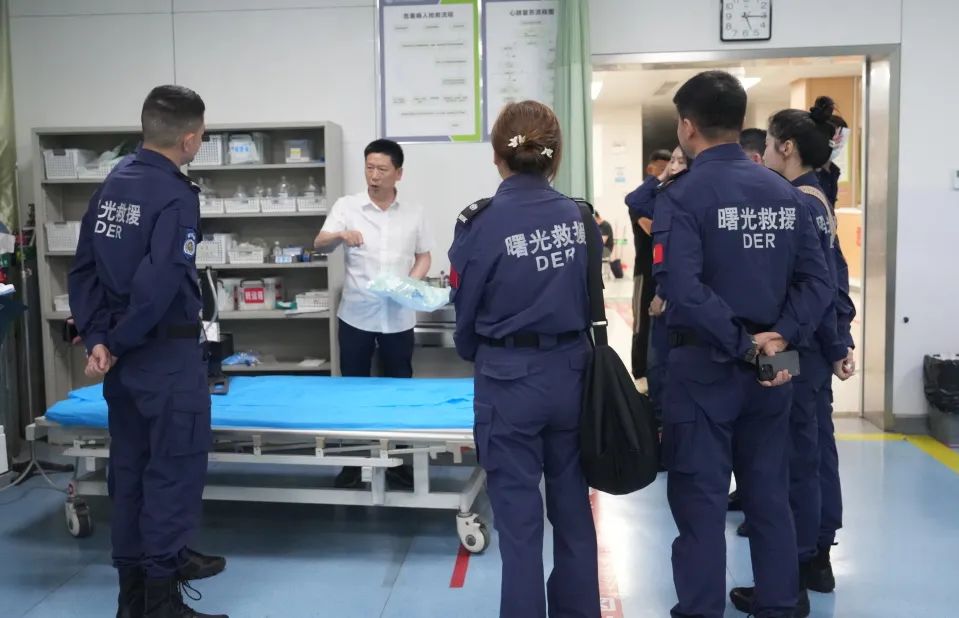随后,刘队长一行人在急诊医学科医疗中心院长邹贵全的带领下, 参观了医院急诊病区,邹院长向救援队介绍了萨博、心肺复苏仪和ECMO等急救设施,邹院长还跟大家科普了一些自救知识,邹院长说:“己若不保,何以救人”,他希望救援队在全力救助他人时,也要保障自身的安全。