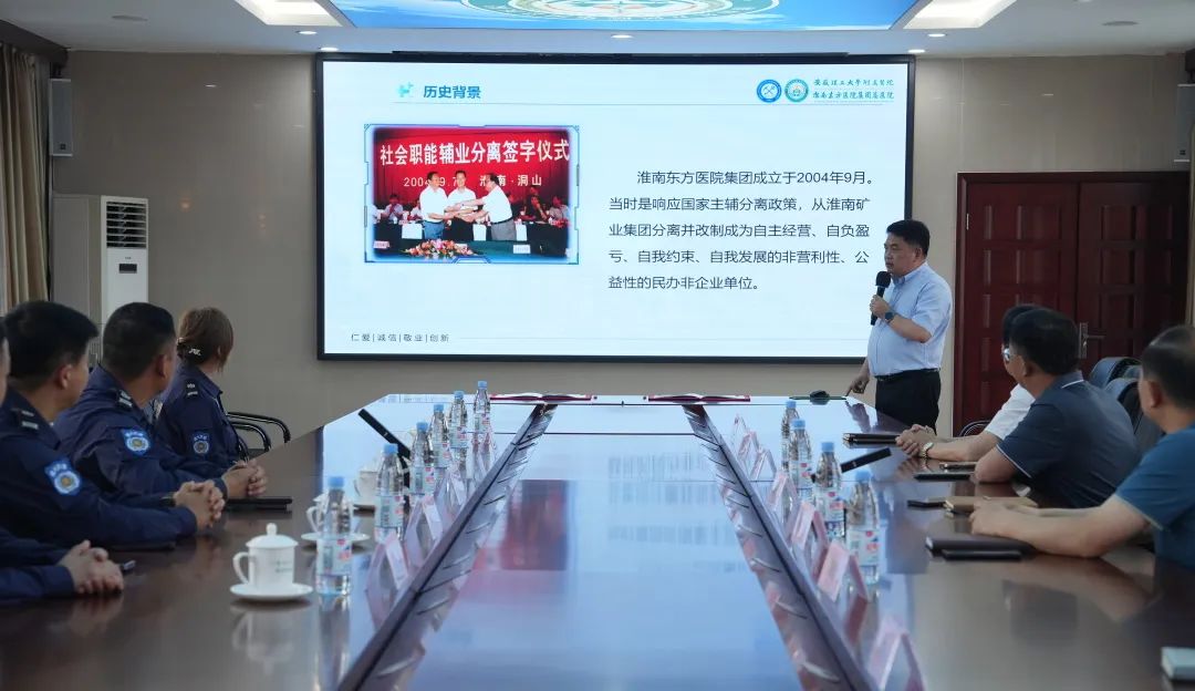 座谈会开始之前,朱院长首先对刘队长一行人莅临淮南东方医院集团表示热烈的欢迎。随后,朱院长向大家介绍了集团概况,并表示双方合作空间较大,东方医院集团是国家应急救援队之一,参与过矿山救援和支援涿州等。同时医院一直以来都热衷公益事业,多年来东方医院集团始终坚持“以人为本,患者至上”的服务宗旨,社会援助也是医院义不容辞的责任。今后,医院将充分利用自身优势,帮助淮南市曙光救援队解决健康问题和普及医疗知识,医院将定期为救援队队员进行专业急救培训,提升队员医疗救援技能,共同守护生命安全。座谈会中朱院长也不断夸赞淮南市曙光救援队是一支非常专业的救援队。