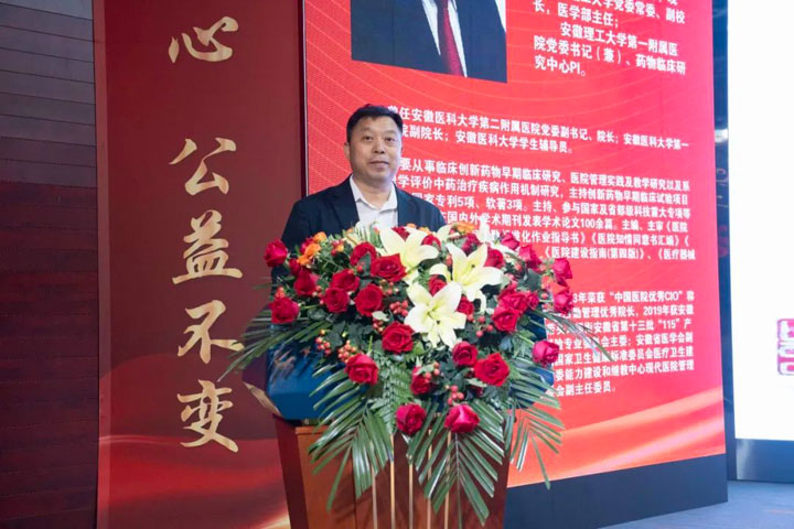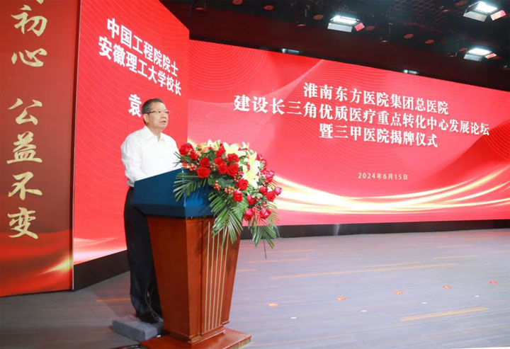 中国工程院院士、安徽理工大学校长袁亮代表学校对淮南东方医院集团总医院顺利通过国家三级甲等医院评审表示热烈祝贺,并深情回顾了校院20年来的携手合作积淀的深情厚谊以及大力支持、全力帮助医院创建“三甲”的艰辛历程。他强调,近年来我校大力发展医学教育,瞄准职业安全健康领域前沿问题,与知名校企院所开展深度合作,开展关键技术攻关,承担了一批重大项目,产出了一系列重大成果。期待东方医院集团总医院立足“三甲”新起点,更加全面深度融入学校优势平台,在学科建设、人才引培、科技创新、医教协同等方面创新局、开新篇,为更好地服务淮南及周边区域人民健康贡献应有力量!