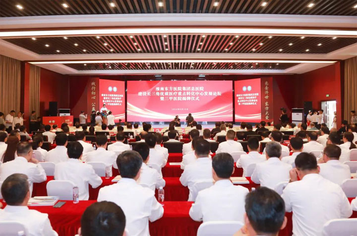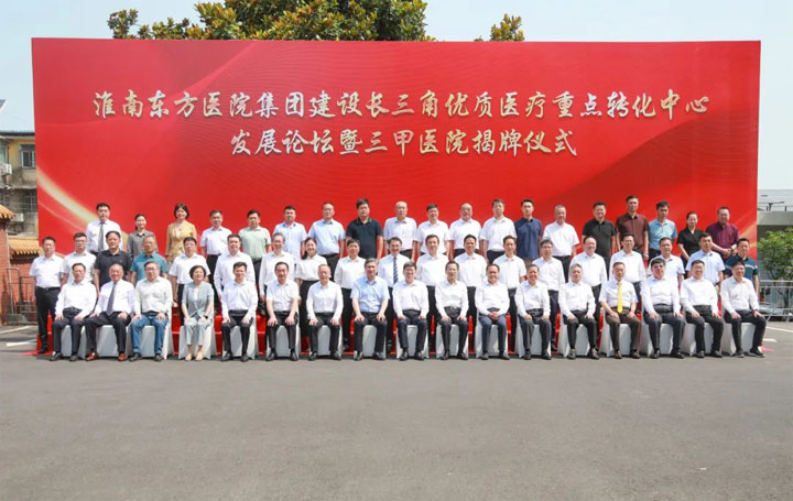 6月15日上午,淮南东方医院集团总医院建设长三角优质医疗重点转化中心发展论坛暨三甲医院揭牌仪式在淮南东方医院集团总医院举行。淮南市委书记任泽锋,市委副书记、市长张志强,市人大常委会主任陈儒江,省卫健委党组成员、副主任杨绪斌,市委常委、市委秘书长、市委政法委书记文见宝,副市长陆晞,市政协副主席董众兵,安徽理工大学党委书记郭永存,中国工程院院士、安徽理工大学校长袁亮,淮河能源控股集团公司党委书记、董事长王世森,市政府秘书长戴宜斌,上海交通大学医学院附属瑞金医院副院长沈柏用,淮南东方医院集团党委副书记、董事长江永强等出席仪式。揭牌仪式由淮南市卫生健康委员会党组书记汪世福主持。