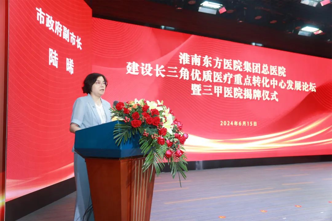 淮南市副市长陆晞代表淮南市人民政府,向淮南东方医院集团总医院成功晋级三级甲等医院表示热烈的祝贺。她指出,此次淮南东方医院集团总医院成功创建三级甲等医院,标志着淮南市又多了一家高质量、高水平的大型综合医院,这不仅是淮南东方医院集团总医院发展史上一个重要的里程碑,也是淮南卫生健康事业发展史上浓墨重彩的一笔。同时希望东方医院集团总医院今后能在淮南市人民政府的关心支持下,以“三甲”为新的起点,勇于创新,勤于探索,不断强化重点专科和学科建设,持续加大医学人才培养力度,努力推动临床诊疗和医学研究水平不断提高,走出一条特色明显、优势突出的学科发展之路。坚持不懈提高医院管理和服务水平,切实改善淮南市民群众就医体验,为淮南市医疗卫生事业做出更大的贡献!