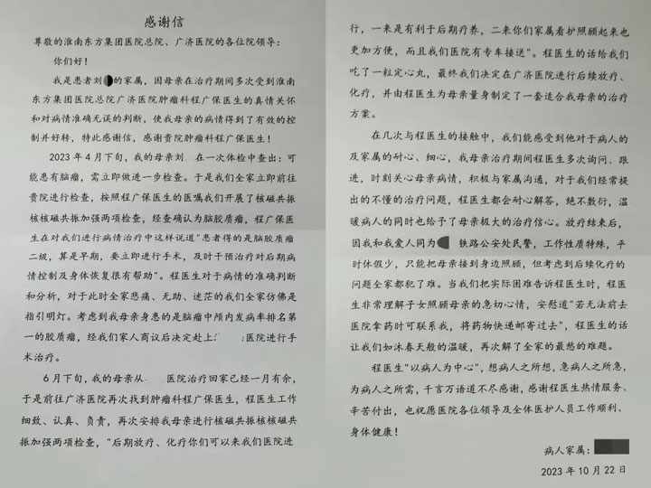 2022年6月,一名“肺恶性肿瘤”的家属带着锦旗找到院领导,虽然家人不幸患癌,但程医生充分尊重患者和家属,不仅尽心全力治疗,还用自己的言行温暖了老人一家。2023年5月,一名肿瘤分期较晚,一般情况较差的“下咽癌伴颈部淋巴结转移”的患者,在程医生治疗下,生活质量得到了很大的改善。在收到患者家属送来感谢红包时,他坚守底线,再次拒收红包。2023年10月,一名“右额叶占位”的患者求诊程医生,凭借丰富的临床经验,程医生高度怀疑其系“脑胶质瘤”,患者手术病理证实了程医生的判断。术后程医生为其制定了个体化抗肿瘤治疗,及时提醒患者办理大病医保,在得知老人要和子女前往外地生活,无法及时前来复诊取药后,程医生积极协调,定期将治病救命的药品寄给老人。