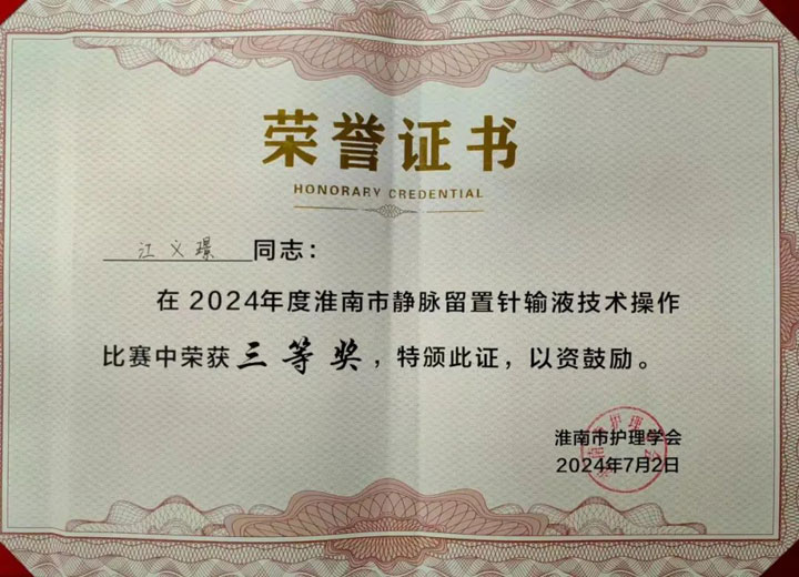 经过激烈的预赛,淮南东方医院集团广济医院骨泌科护士江义璟顺利入围决赛,在集团总院刘艳华主任的精心指导下,江义璟成功获得淮南市留置针静脉输液技术操作比赛三等奖,展示了东方医院集团护理工作者的优秀技能和靓丽风采。
