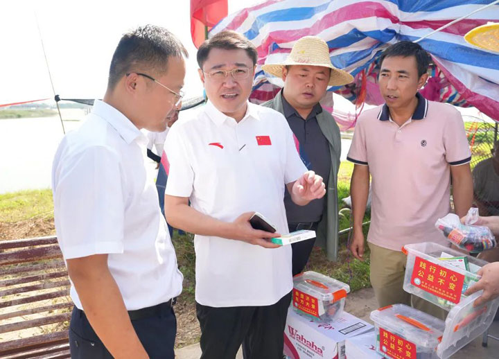 受上游强降雨影响,正阳关水位持续上涨,丰庄镇闻“汛”而动,快速组织一二线民工投身防汛“战场”,筑起一道道防汛抗灾坚强防线,防汛一线人员面临着“上蒸下煮”的恶劣环境,这也深深牵动着董事长的心。7月23日下午,董事长一行来到寿县丰庄镇防洪值班点,慰问和看望了日夜驻守在河堤的防汛值守人员,为他们发放了防暑防虫防蛇药物和矿泉水,以表达对防汛一线同志们的敬意和对防汛工作的支持。