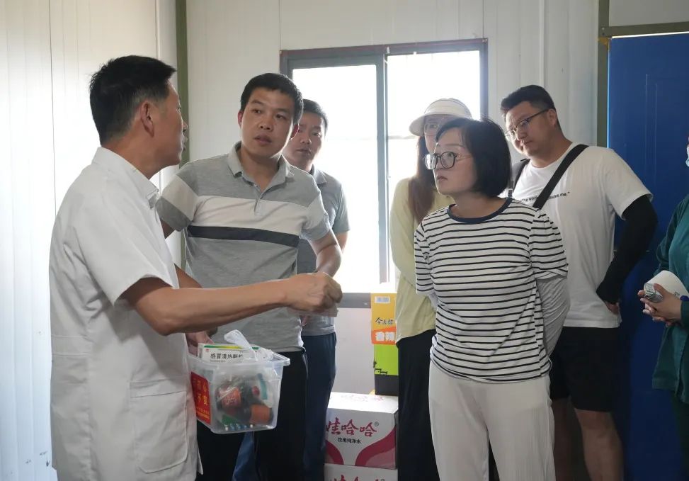 在寿县县委常委、副县长房鲲鹏,县委组织部副部长任伟带领下,江永强董事长一行领导沿着淮河丰庄段大坝,将准备好的药品箱和水分别送到5个站点防汛一线同志们手中,药箱里有蛇药片、藿香正气水、风油精、诺氟沙星胶囊、感冒清热颗粒、碘伏、纱布、棉签等,正适用于户外防汛值守的同志们。董事长耐心细致地向防汛人员介绍急救药箱中各类药品的用途、使用方法,董事长关切地询问了值守、汛情等情况,当了解到指挥所不仅蚊虫肆虐,还经常有蛇出没时,董事长说道,“我们带来的药箱中有蛇药片,可以清热、解毒,消肿止痛,如果有同志不慎被毒蛇咬伤就可以使用这个。”董事长还耐心传授了蛇药片的使用方法,可内服又可外用,用于毒蛇、毒虫咬伤十分有效。最后,董事长对奋战在大坝上24小时值守的同志们深感敬佩,并对这些坚守岗位、保卫家园的值守人员表示衷心地感谢。