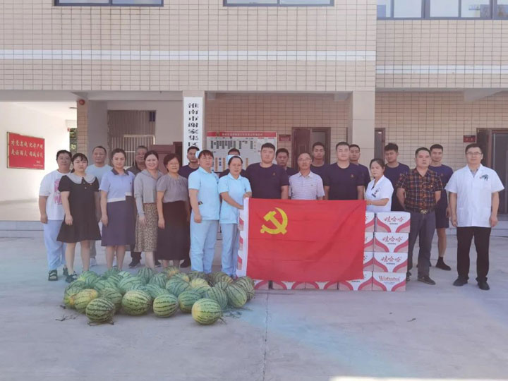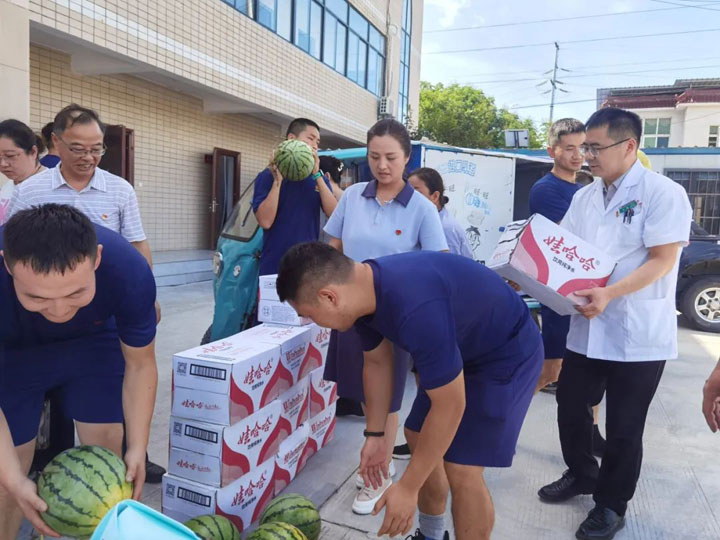 7月25日上午,在“八一”建军节来临之际。广济医院组织党员来到谢家集区消防救援队,向长期奋斗在抢险救援一线的消防官兵,送上一份夏日的清凉和节日的慰问。