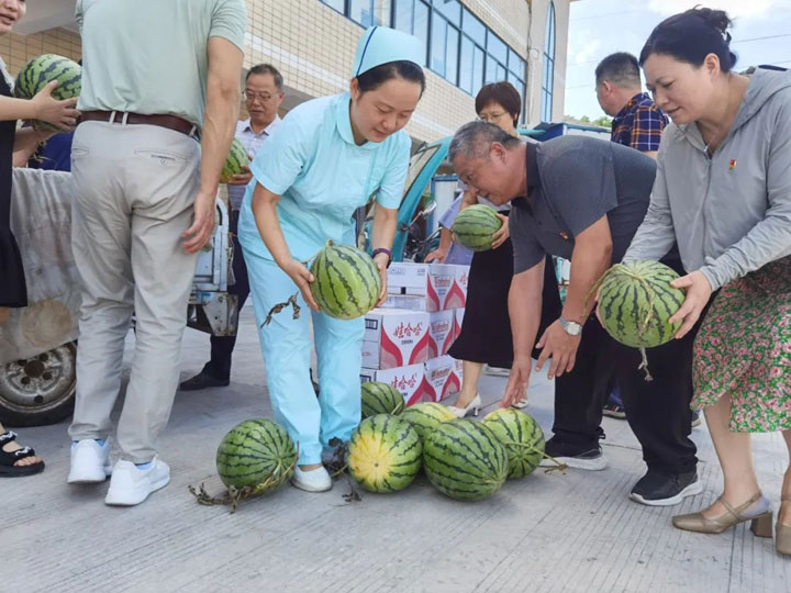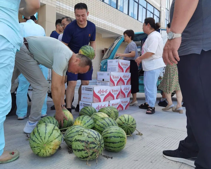 上午9点,广济医院党委书记胡文生一行来到谢家集区消防救援大队。一颗颗翠绿的大西瓜,一箱箱沉甸甸的矿泉水,不仅为消防战士们消退炎炎暑气,也送上了浓浓敬意。“你们辛苦了,不论严寒酷暑,不管黑夜白天,奔袭逆行在守护人民生命安全的道路上,这是我们的一点心意,感谢你们。”医院党委书记胡文生说。
