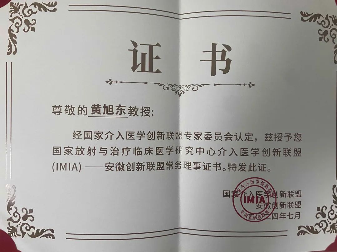 近日,国家介入医学创新联盟(IMIA)安徽省创新联盟成立大会在蚌埠召开,本次大会贯彻国家卫健委《“十四五”国家临床专科能力建设规划》的中心思想,秉持创新、协作、共赢的理念,以创新为核心,以人才发展为方向,打造新型研究体系,提高协同创新水平。会上,东方总院介入科被授予“安徽省介入医学创新联盟常务理事单位”,黄旭东主任被授予常务理事证书。医院将以此为契机,将介入诊疗新技术向全市乃至本地域内推广应用,造福地方百姓。