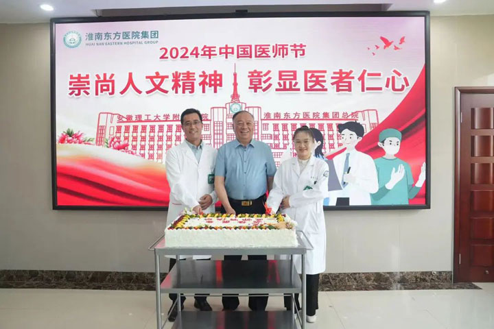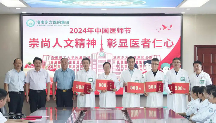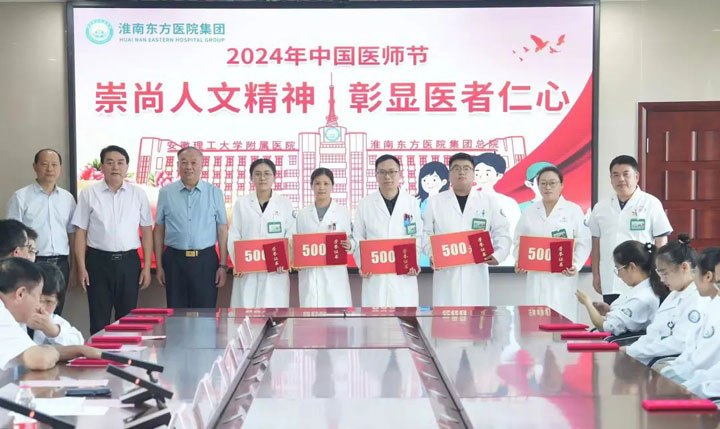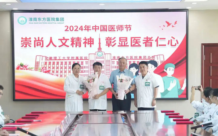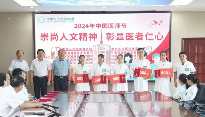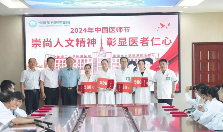 2024年8月19日是第七个“中国医师节”,今年的节日主题是“崇尚人文精神,彰显医者仁心”。在医师节来临之际,淮南东方医院集团党委书记、名誉董事长江鸿方带领大家在办公楼五楼会议室,开展了医师节庆祝仪式。同时,对工作中团结奋进、敢于创新、乐于奉献的李枫、赵守成、程家凤等30多名优秀医师进行了现场表彰,并鼓励全院职工向先进看齐、向先进学习,为推动医院高质量、可持续性发展做出新的更大贡献。