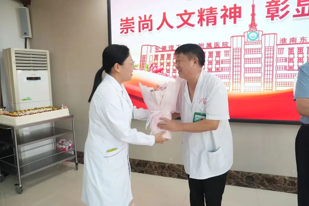 斗转星移,日月如梭,医院的发展也离不开老一辈医务工作者的无私奉献。在这个特殊的日子里,东方总院朱胜副院长和儿科主任黄家琴,分别向他们的恩师江鸿方书记和赵守成院长送上了节日的祝福和鲜花,感谢他们用丰富的经验、精湛的医术为医院的发展奠定了坚实的基础,为大家树立了光辉的榜样。仪式最后,记录下了这爱的“医瞬间”,江鸿方书记带大家切蛋糕、分蛋糕,共同品尝医师节的甜蜜与喜悦。