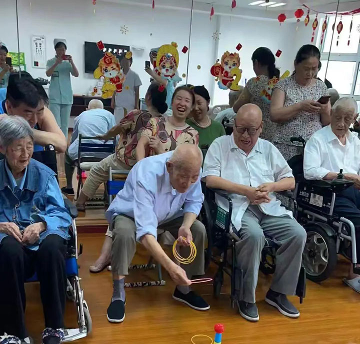 随后进行的是套圈游戏,以两人一组的形式展开竞赛,该游戏有效锻炼了老年人的手部、脑力以及视觉协调能力,有助于预防老年痴呆症。许多参与者展现了非凡的耐心和技巧,赢得了现场观众的阵阵掌声。