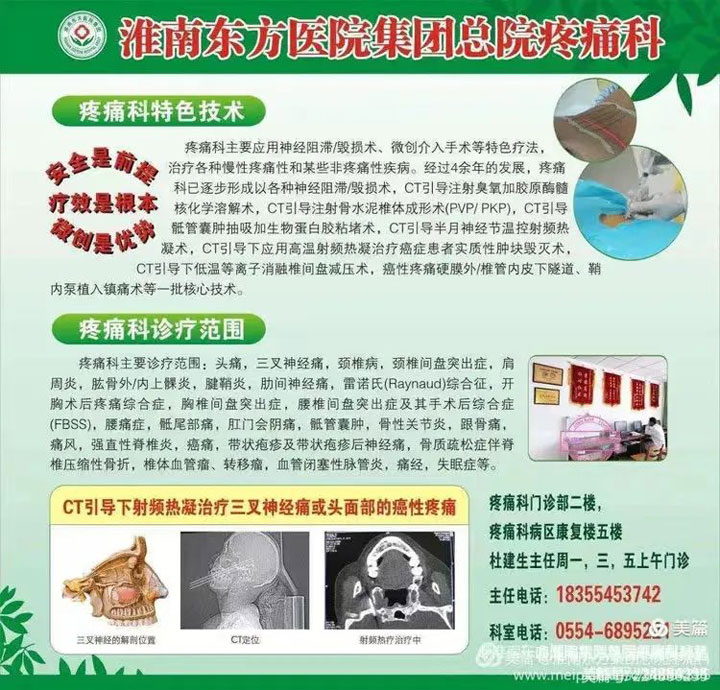 科室经过近年来的发展壮大,现拥有一支专业理论知识丰富、技术精湛的医疗团队。以全国尖端技术:如各种神经阻滞/毁损术,注射胶原酶髓核化学溶解术、注射骨水泥椎体成形术、半月神经节温控射频热凝术、脊髓神经根射频消融术、癌性疼痛硬膜外/椎管内皮下隧道、鞘内泵植入镇痛术作为核心技术,最大限度解决长期困扰患者的疼痛症状。