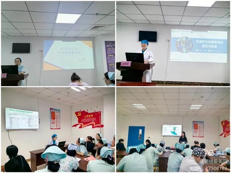 护理部牛宁和汪海霞、重症医学科刘朔、神经外科耳鼻喉科顾媛媛及各科室护理骨干张菲菲、张晓静、郭艳、高洁分别院科两级分层级培训落实与核查、新入职护士规范化培训、实习生教学与管理、护理技能培训等方面进行授课,内容深入浅出,贴近临床。