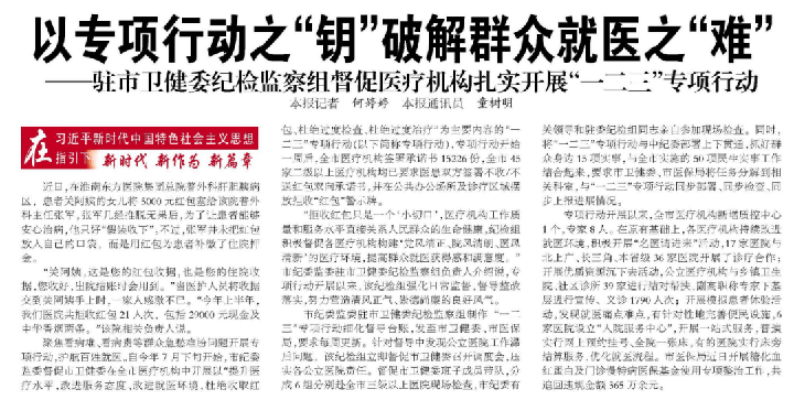 2024年9月25日,淮南日报对淮南市卫健委“一二三”专项行动进行了题为《以专项行动之“钥”破解群众就医之“难”——驻市卫健委纪检监察组督促医疗机构扎实开展“一二三”专项行动》的专题报道。东方总院迅速贯彻落实市卫健“一提升、两改进、三杜绝”工作部署,取得明显成效,尤其拒收红包的案例被作为文章开题使用。报道中提到,东方总院通过加强医德医风教育,建立健全相关制度,以及公开透明的医疗服务流程,成功营造了风清气正的医疗环境,为“一二三”专项行动的开展做出了表率。