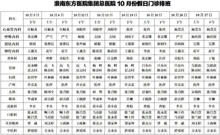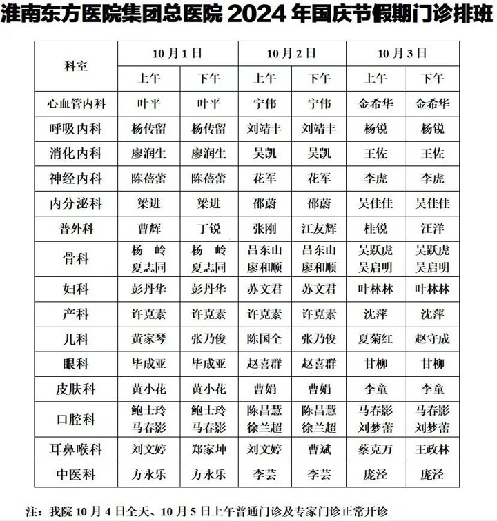 尊敬的市民朋友们:为了最大限度地满足患者朋友在国庆期间的看病需求,确保大家假日就医无障碍,淮南东方医院集团节日期间(10月1日~10月7日)所有科室照常接诊,各科室医务人员全力为您提供专业、优质的医疗服务。