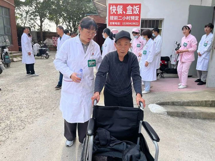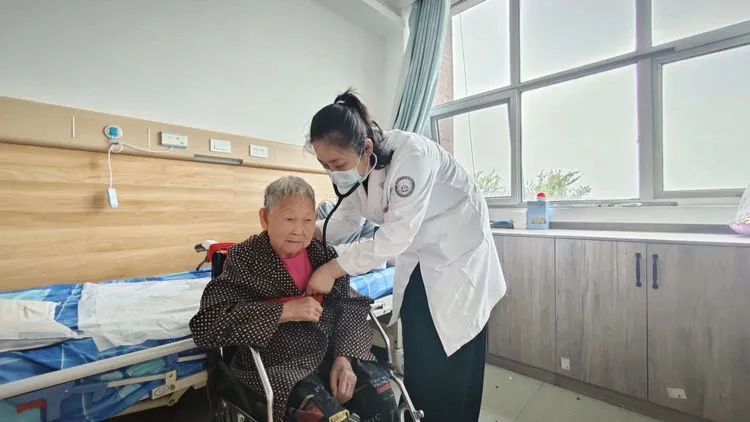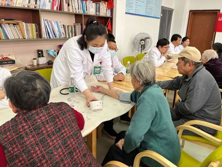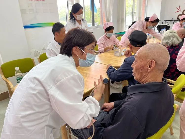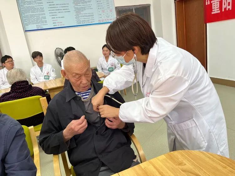 一位头发花白的老奶奶坐在椅子上,紧张地看着医生为她测量血压。医生微笑着安慰她:“奶奶,别紧张,您的血压有点高,平时要注意饮食清淡,多休息。”老奶奶连连点头,眼中满是感激。旁边的一位老爷爷则对医生竖起了大拇指:“你们这些医生真是太好了,在重阳节还前来看望,让我们感受到了社会的关爱。”