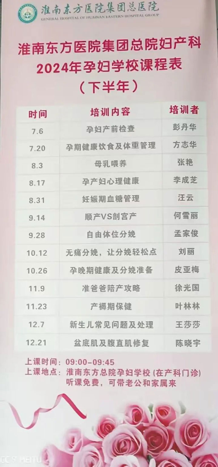 授课地点:淮南东方医院集团总院妇产科门诊三楼孕妇学校