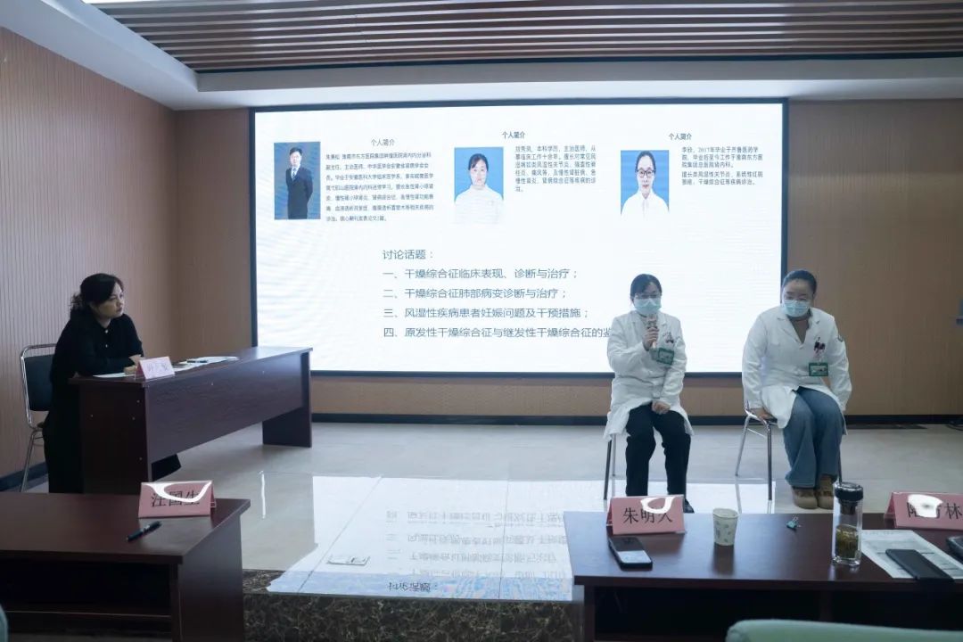 继教班开幕式由许坤主任主持,朱胜院长致开幕辞,他对邀请到的继教班专家表示感谢,要求学员认真听讲,学有所成。省医学会风湿免疫病学会主委汪国生发言,他讲到风湿免疫病目前国内、省内发展状况,表示继续给予集团学术、技术支持。随后继教班开始,汪国生教授主讲《CTD-ILD诊断与治疗循证》,由朱明久主任主持。张晶晶教授主讲《Ig4相关性疾病简介暨罕见病概述》,由王斌主任主持。陆方林教授主讲《系统性红斑狼疮诊疗规范》,由赵大奎主任主持。许坤主任主讲《干燥综合征超药品说明书用药中国临床实践指南2023版解读》,由黄金波主任主持。朱明久主任主讲的《狼疮性肾炎诊断与治疗诊治进展》,由邱璐护士长主持。会议最后环节是讨论,讨论的主题是《干燥综合征诊治体会与疑惑》,参加讨论人员是朱美松主任、刘秀凤主治医师、李欣医师及所有参加听课的专家和学员,由叶爱主任主持,经过讨论,大家对干燥综合征诊治及干燥综合征并发症的处置有进一步的认识。