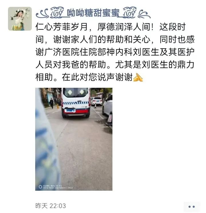 我爸是多年的脑梗后遗症老病号,生活不能自理,去年入冬时节,我爸唯一能活动的左手突然不能活动了。当时我一个女孩子在家遇到这种情况,不仅害怕,而且惊慌失措。这时突然间我想起了之前我爸在广济(医院)看病时添加的刘主任的电话号码。抱着试试看的心态,我拨打了过去,没想到过一会儿,刘主任竟带着医护人员直接驱车来到我家,给我(爸)问诊,按照他出具的药方,在我爸服用一段时日后,竟然真的明显好(转)。