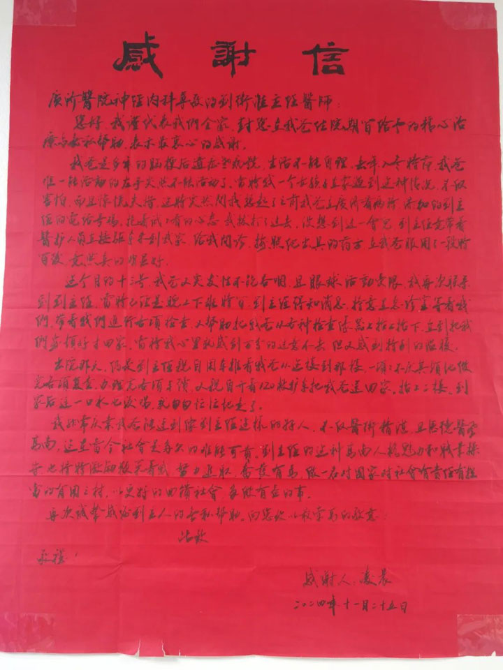 一封感谢信,道不尽浓浓医患情。洋洋洒洒间,尽显医者仁术仁心。刘卫淮主任立足岗位,用自己的真心和医术温暖患者一家。他积极响应集团和医院领导号召,依托集团神经内科医疗中心,带领科室医护努力钻研新技术,2024年顺利开展“经桡动脉全脑血管造影术”,大大提高了患者手术舒适度及接受度,降低手术风险。