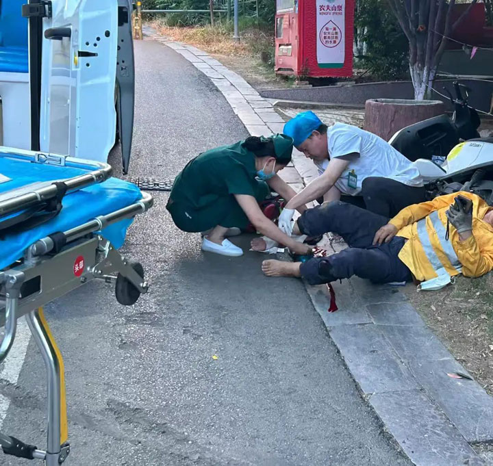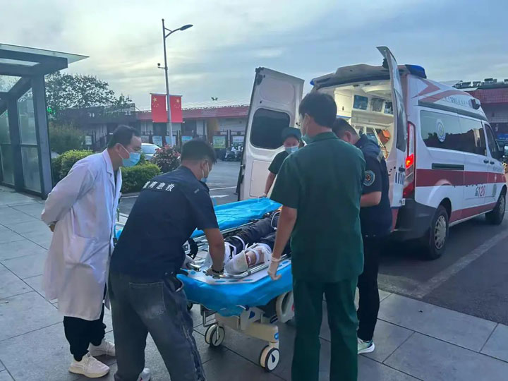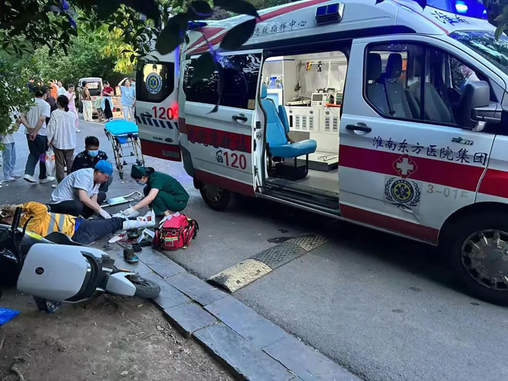 5月2日傍晚时分,120急救电话响起,淮南东方医院集团总医院急诊科接到指令后迅速安排急救人员抵达现场,展开了一场争分夺秒的生命救援行动。到达现场后,救护车辆停靠在路边,专业急救团队立即投入工作,确保伤者得到及时救治。