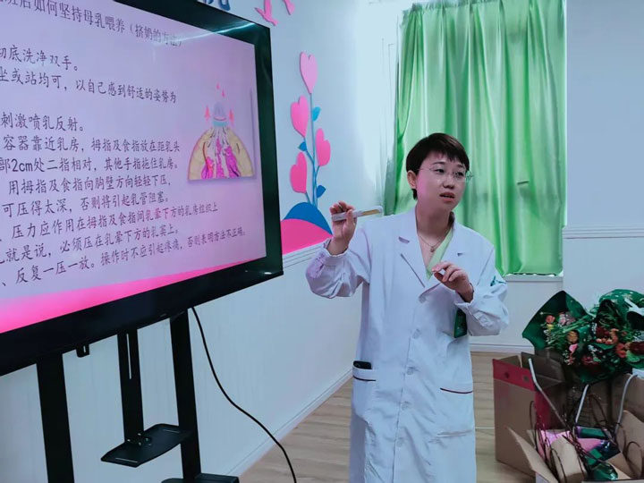 活动当日,医院特别推出惠民举措:所有当天就诊的孕产妇免除挂号费及基础产检费用。这一贴心政策不仅减轻了孕妈妈们的经济负担,更体现了医院对母婴群体的关爱与支持,吸引了众多家庭前来参与。妇产科张艳主任以“母乳喂养的科学与艺术”为主题,为现场家庭带来了一场生动的知识讲座。她从母乳的营养价值、喂养技巧、常见问题应对等方面展开讲解,结合临床案例深入浅出地解答了“初乳的重要性”“哺乳期饮食禁忌”“涨奶缓解方法”等孕妈妈关注的热点问题。张主任强调:“母乳是宝宝最天然的‘疫苗’,坚持母乳喂养不仅能增强婴儿免疫力,更能促进母婴情感联结,这份爱的纽带将伴随孩子一生。”