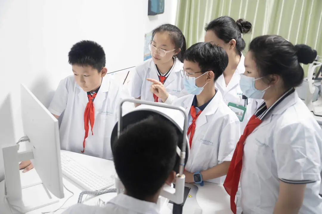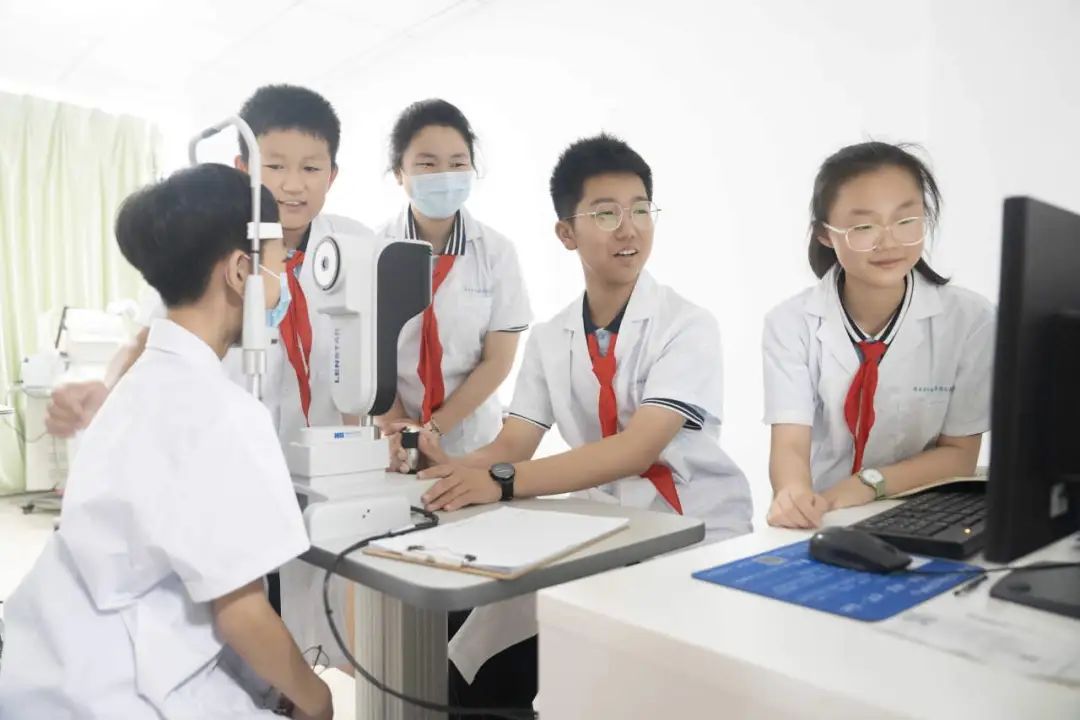 在眼科门诊,眼科医生为学生们带来了一堂生动有趣的爱眼知识讲座。医生深入浅出地讲解了眼睛的结构、近视的成因以及如何预防近视。孩子们听得格外认真。最让学生们兴奋的环节莫过于亲身体验眼科检查设备了。在眼科医生的指导下,他们小心翼翼地操作着裂隙灯、电脑验光仪等仪器,为自己的小伙伴进行检查。虽然操作还不太熟练,但每个人都学得有模有样,仿佛自己真的成为了能为他人解决眼部问题的专业医生。