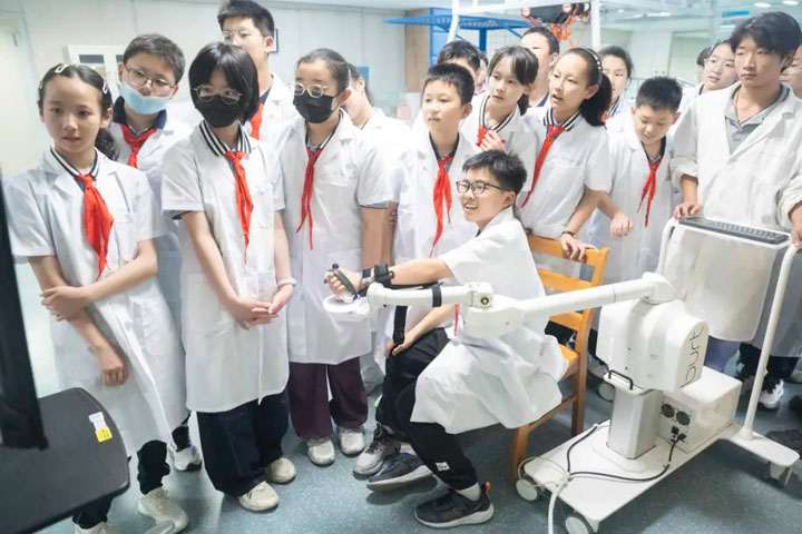 走进康复科,进入康复世界。医生向学生们介绍先进的康复医疗设备,帮助他们了解康复医学领域的科技发展,感受康复治疗师的工作内容和环境,培养他们对医学和科技的兴趣。在康复治疗室,学生们体验了上肢康复机器人设备,了解这种前沿技术在康复治疗中的应用,对患者的康复过程有了更深刻的理解。