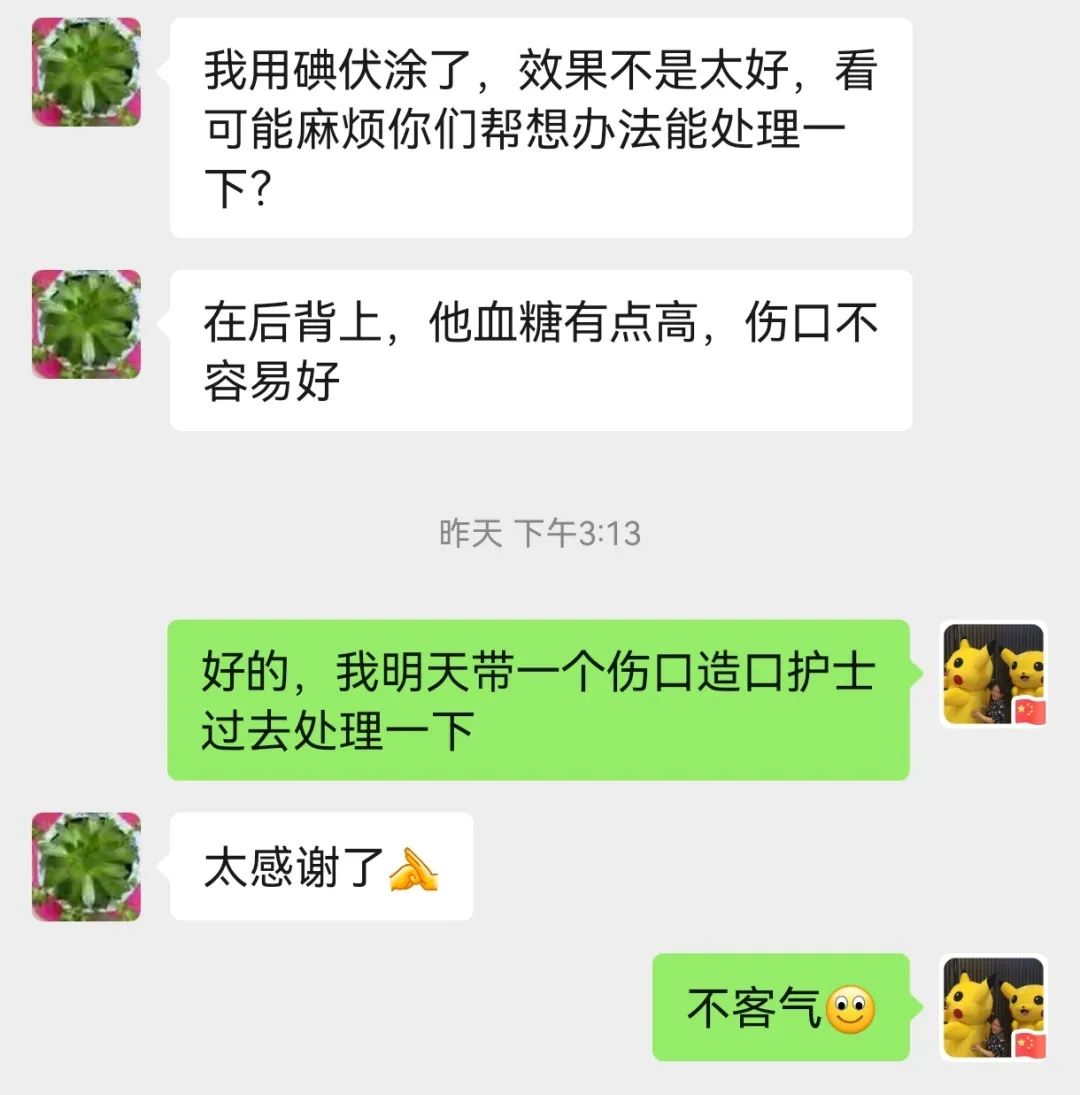 对于家住泉山湖、行动不便的王先生(化名)来说,术后复查抽血和护理难以愈合的肩背部伤口曾是困扰全家的难题,作为一名脑部肿瘤术后并发脑梗的患者,行动受限,加之血糖偏高导致伤口迁延不愈,往返医院检查与换药格外艰辛。在家属联系东方总院寻求帮助后,一份量身定制的专业上门服务迅速响应。