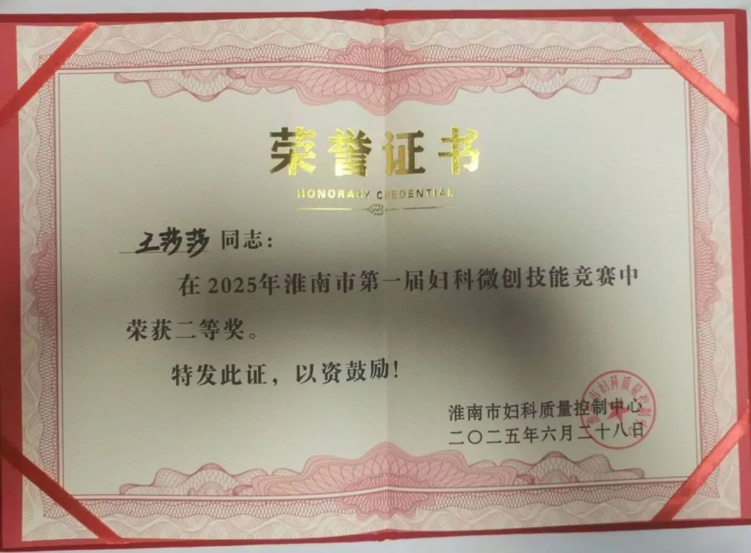 近日,2025年淮南市妇科质控中心第一次工作会议暨淮南市第一届妇科微创技能竞赛圆满落幕,东方总院妇产科传来捷报,科室青年骨干医师王莎莎、吴芳凭借扎实深厚的专业功底和精湛娴熟的操作技术,在激烈的角逐中脱颖而出,双双荣获个人二等奖的优异成绩!