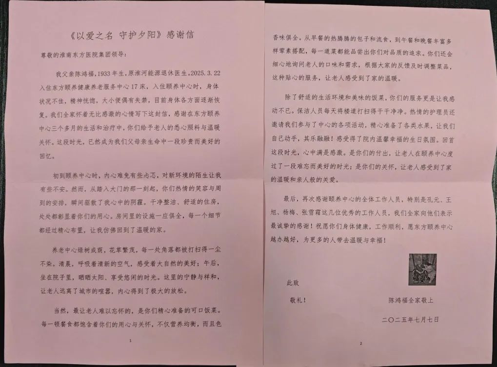 “回首这段时光,心中满是感激。是你们的付出,让老人在颐养中心度过了一段难忘而美好的时光;是你们的关怀,让老人感受到了家的温暖和亲人般的关爱。”家属在信末动情地写道,并向全体工作人员致以最诚挚的感谢,祝愿东方颐养中心越办越好,为更多的人带去温暖与幸福!