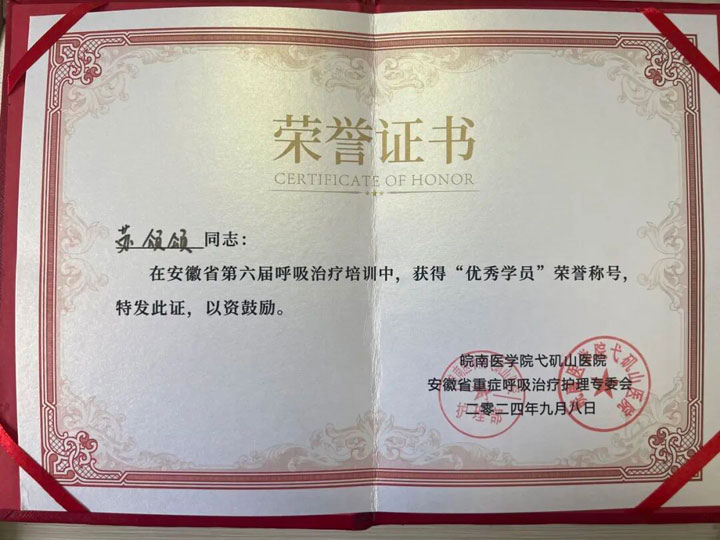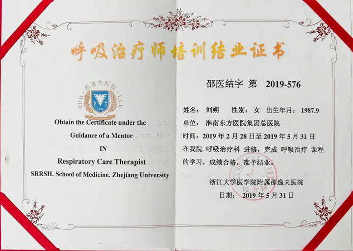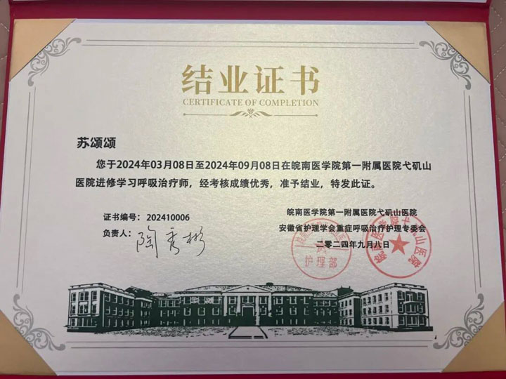 优异的成绩离不开个人努力,更得益于医院长期的人才培养和学科建设。淮南东方医院集团总医院重症医学护理团队多年来致力于呼吸治疗与危重症患者康复领域的探索与实践,注重专科护士的培养与梯队建设。目前医院已拥有两名经过系统培训认证的呼吸治疗师——护理部副主任刘朔与苏颂颂护士,她们分别赴浙江大学医学院附属邵逸夫医院与弋矶山医院完成呼吸治疗专业培训,并以优异成绩毕业返岗。