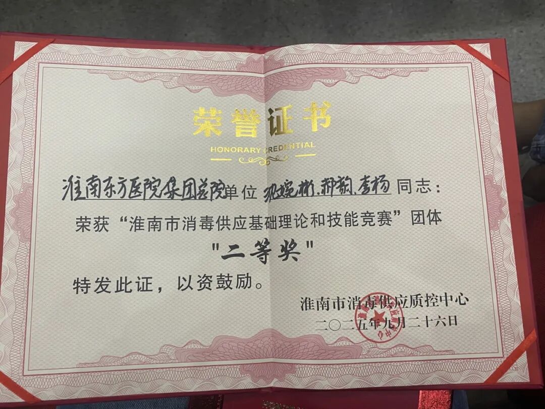 比赛中,淮南东方医院集团总医院选派沈婉彬、郝韵、李杨三位同志组队参赛。她们在紧张的团队理论考试中沉着应对、配合默契,展现出深厚的专业理论素养;在技能比武环节,则凭借规范娴熟的操作、严谨细致的流程,赢得了评委的高度认可。最终,团队以总分优异的成绩荣获团体二等奖。