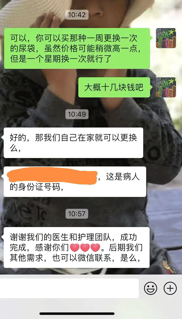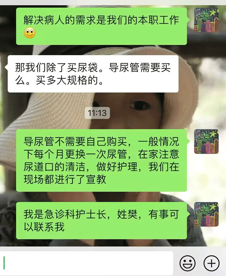 此次上门服务由急诊科邱杰主任保驾护航,护士长樊远芳全程指导,阚誉护师具体操作,形成了一支高效协同的专业医护团队。从前期沟通到现场执行,每一个环节都体现了东方人严谨务实的工作作风和以患者为中心的服务理念。手机屏幕上的聊天记录清晰记录了医患之间的温情互动。关于导尿产品使用、购买方式、家庭更换可行性等问题逐一被解答。