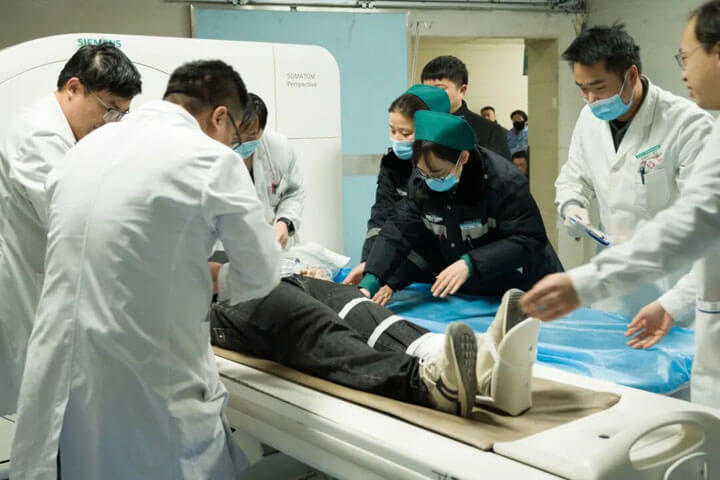 此次演练模拟了一起因交通事故致伤者不同程度受伤,120急救中心接到求救电话后,迅速派出急救团队赶赴“事故现场”。院前医护人员对伤者进行快速评估,实施初步救治措施,并根据创伤评分对患者进行判定。随即,通过“紫云系统”一键启动院内创伤急救绿色通道,将患者伤情等关键信息实时传输至医院创伤中心,实现了“信息跑在车轮前”。患者抵达急诊科后,MDT团队立即接手启动多学科会诊,30分钟内完成诊断并转入手术室,实现接诊、检查、会诊、手术的无缝衔接。